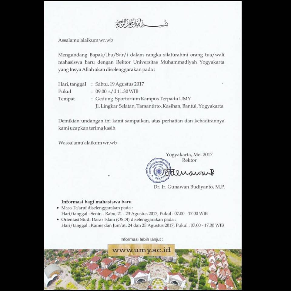 UMY Twitterren: “Undangan silaturahmi orangtua/wali Mahasiswa Baru UMY 2017/2018: Sabtu : 19 Agustus 2017 Waktu : 09.00-11.30 WIB Tempat : Sportorium UMY… https://t.co/Q452n9KMQX”