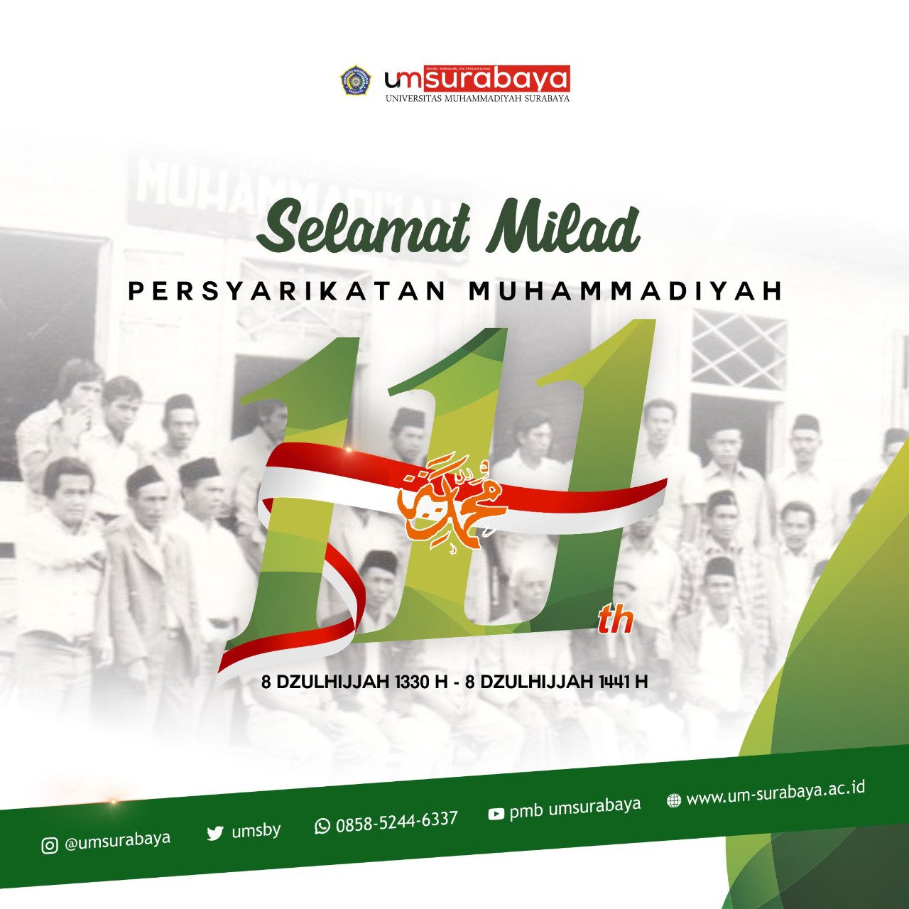 UMSurabaya: “Sejarah besar telah terukir di 8 Dzulhijjah 1330 H Persyarikatan Muhammadiyah terlahir sebagai gerakan amar ma’ruf nahi mungkar Selamat Milad ke 111 tahun Persyarikatan Muhammadiyah, terus membawa terang bagi seluruh
