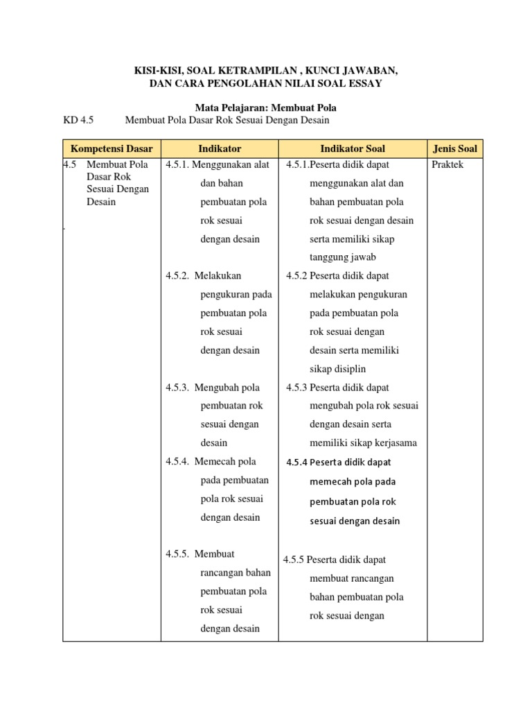 Kisi-Kisi, Soal Ketrampilan , Kunci Jawaban, Dan Cara Pengolahan Nilai Soal Essay Mata Pelajaran: Membuat Pola