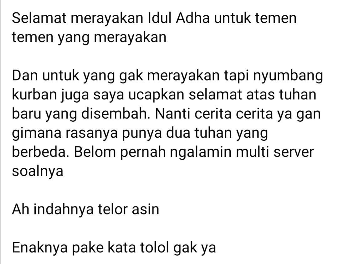 Katolik Garis Lucu en Twitter: “Ada rang-orang punya pikiran: Kaum kristiani yang ikut menyumbang hewan qurban saat Idul Adha sama dengan menyembah dua Tuhan… Piye jal…… https://t.co/sqapd1xZTR”
