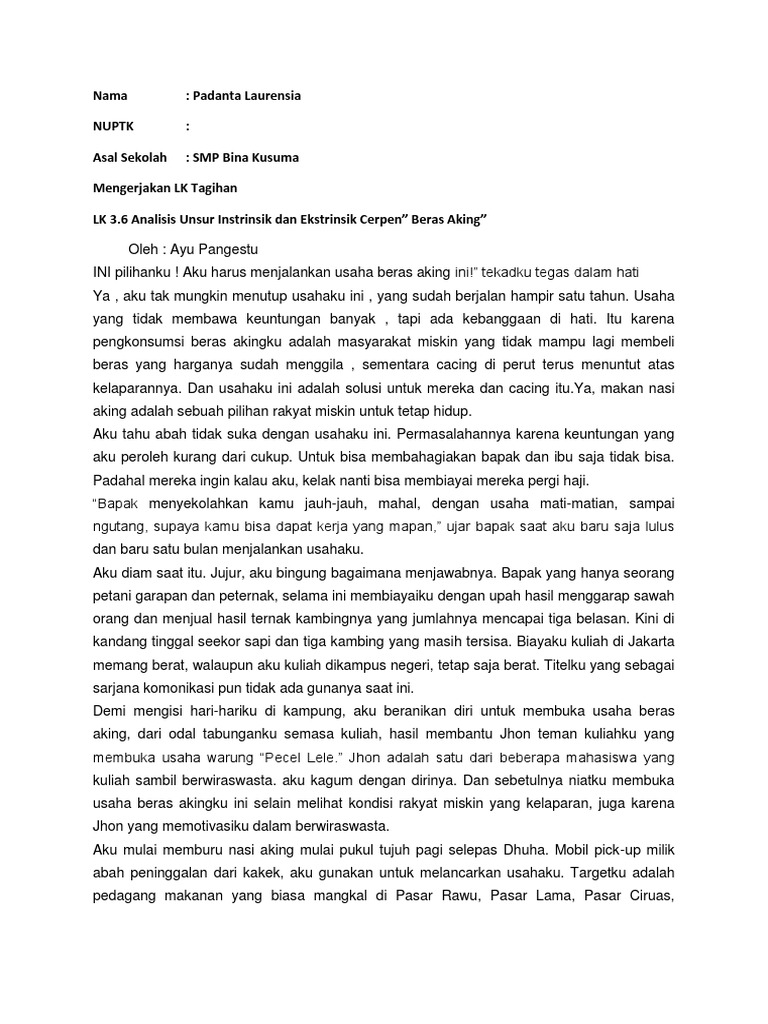 LK 3. 6 Tagihan Menentukan Unsur Instrinsik Dan Ekstrinsik Cerpen