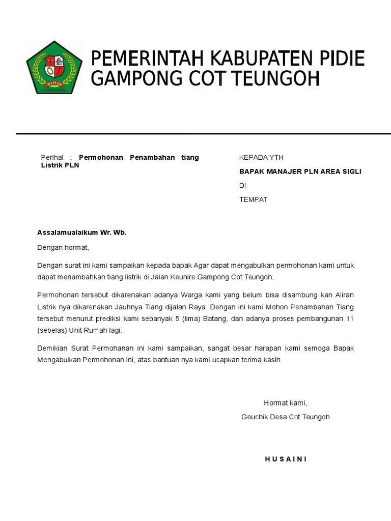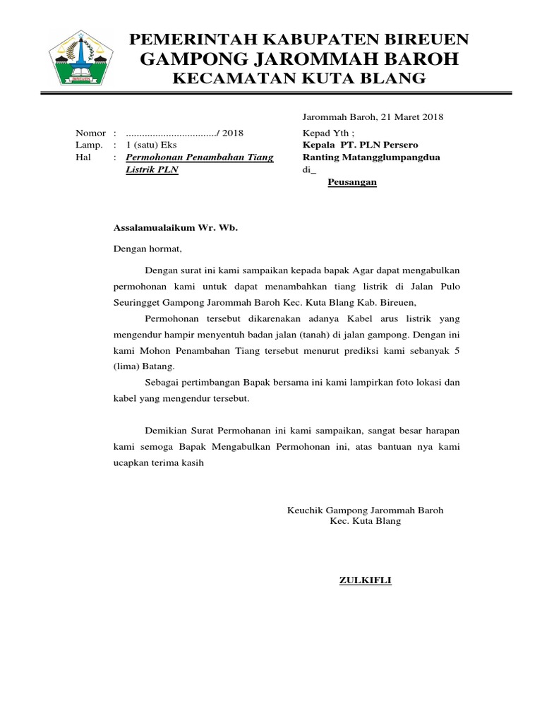 Contoh Surat Permohonan Tiang Listrik Ke Pln - Contoh Seputar Surat