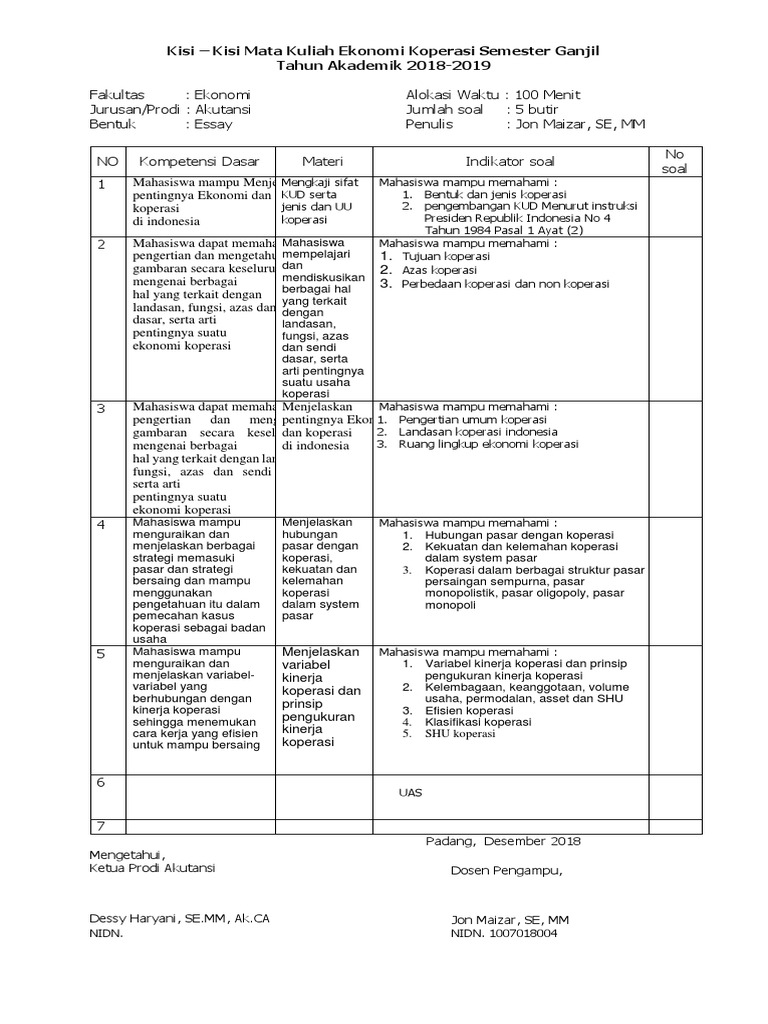 Fakultas: Ekonomi Alokasi Waktu: 100 Menit Jurusan/Prodi: Akutansi Jumlah soal: 5 butir Bentuk: Essay Penulis: Jon Maizar, SE, MM NO Kompetensi Dasar Materi Indikator soal No soal 1