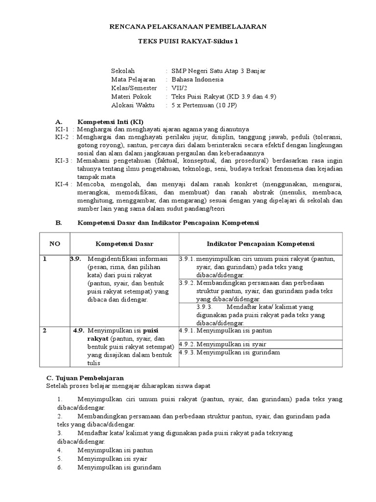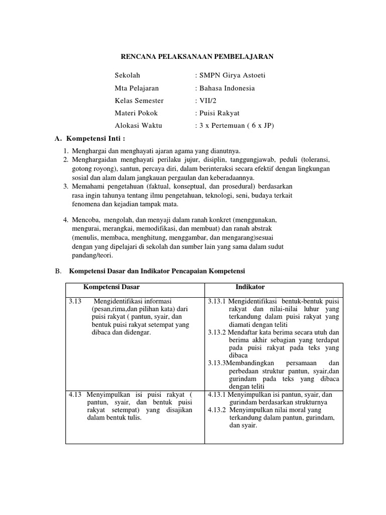 DOC) RENCANA PELAKSANAAN PEMBELAJARAN 1 PUISI RAKYAT | Agus …