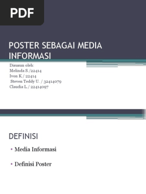 POSTER Definisi 1: Poster adalah media yang merupakan karya seni atau desain grafis yg memuat komposisi gambar dan huruf diatas kertas, kain dll berukuran. - ppt download