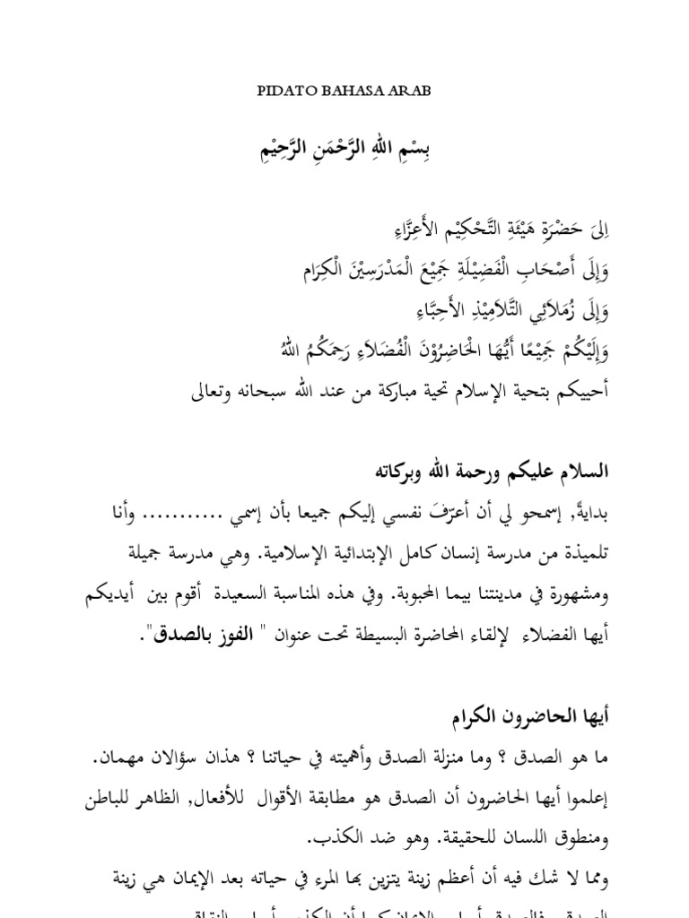 Contoh Teks Pidato Bahasa Arab (Kls I) | Pesantren Isra Noor Bandung
