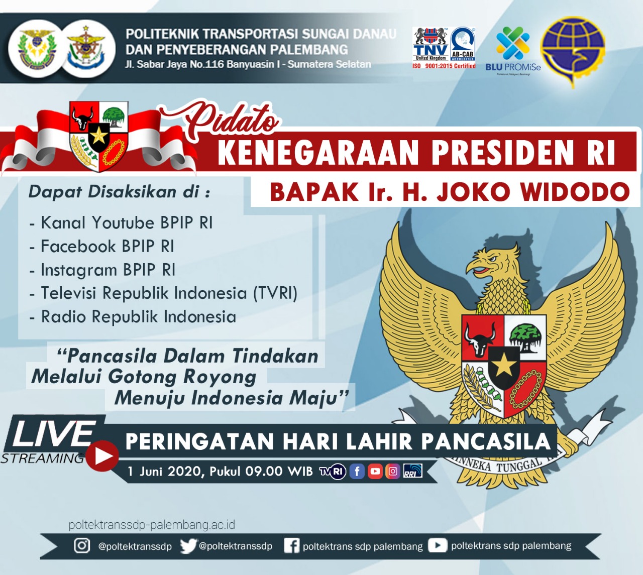 POLTEKTRANS SDP Palembang: “Selamat memperingati Hari Lahir Pancasila 1 Juni 2020. Pancasila Dalam Tindakan melalui Gotong Royong menuju Indonesia Maju. Saksikan Pidato kenegaraan oleh Presiden RI Bpk. Ir H. Joko Widodo