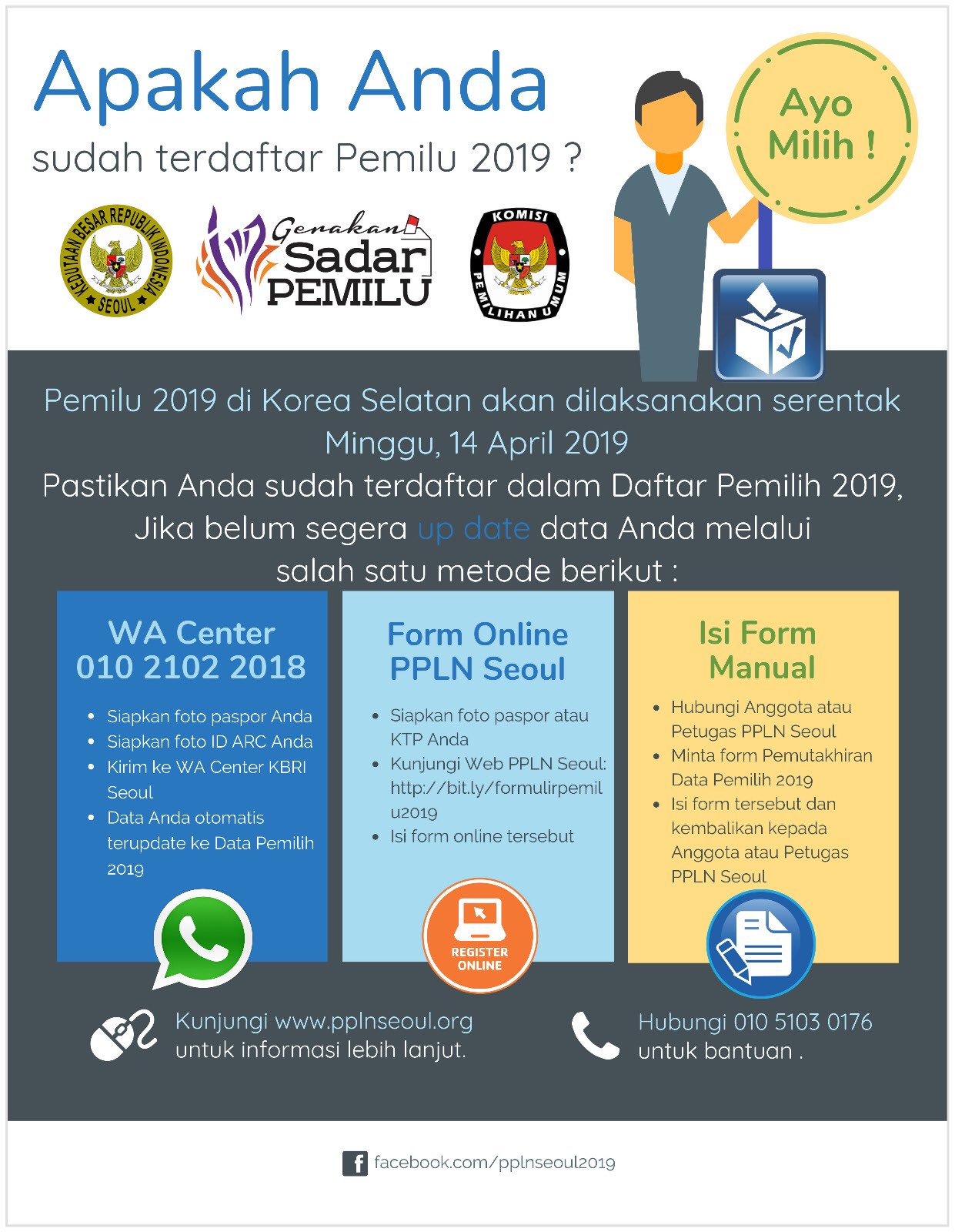 KBRI Seoul on Twitter: “Pemilu 2019 di Korea Selatan akan dilaksanakan serentak pada Minggu, 14 April 2019. Pastikan Anda sudah terdaftar dalam Daftar Pemilu 2019!! Segera update data Anda melalui salah satu