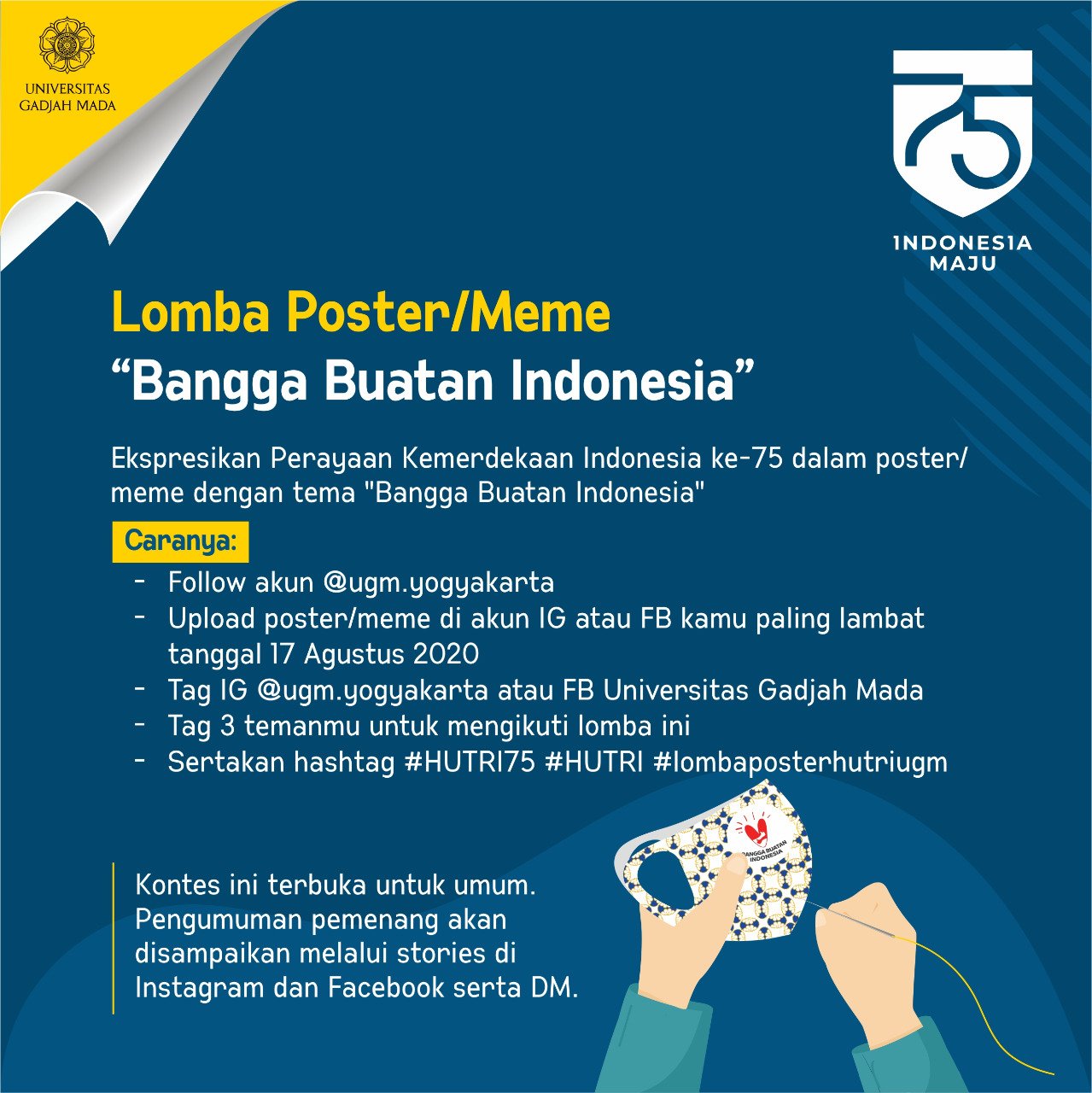 UGM auf Twitter: “Hai kawan UGM! Tanggal 17 Agustus sudah dekat, yuk ekspresikan Perayaan Kemerdekaan RI ke-75 dalam poster/meme dengan tema “Bangga Buatan Indonesia”. Ada hadiah senilai jutaan rupiah lho, untuk poster/meme