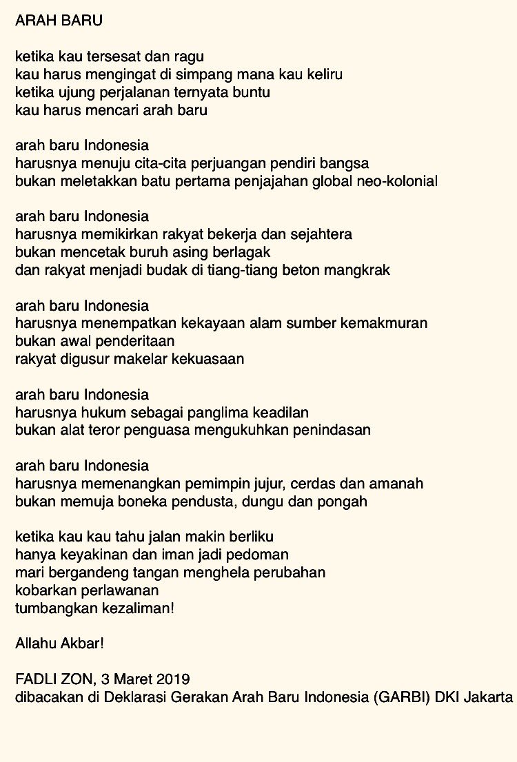 FADLI ZON (Youtube: Fadli Zon Official) “Puisi terbaru sy berjudul “Arah Baru” yg dibacakan di acara Deklarasi @Garbi_Idn DKI Jakarta.… "