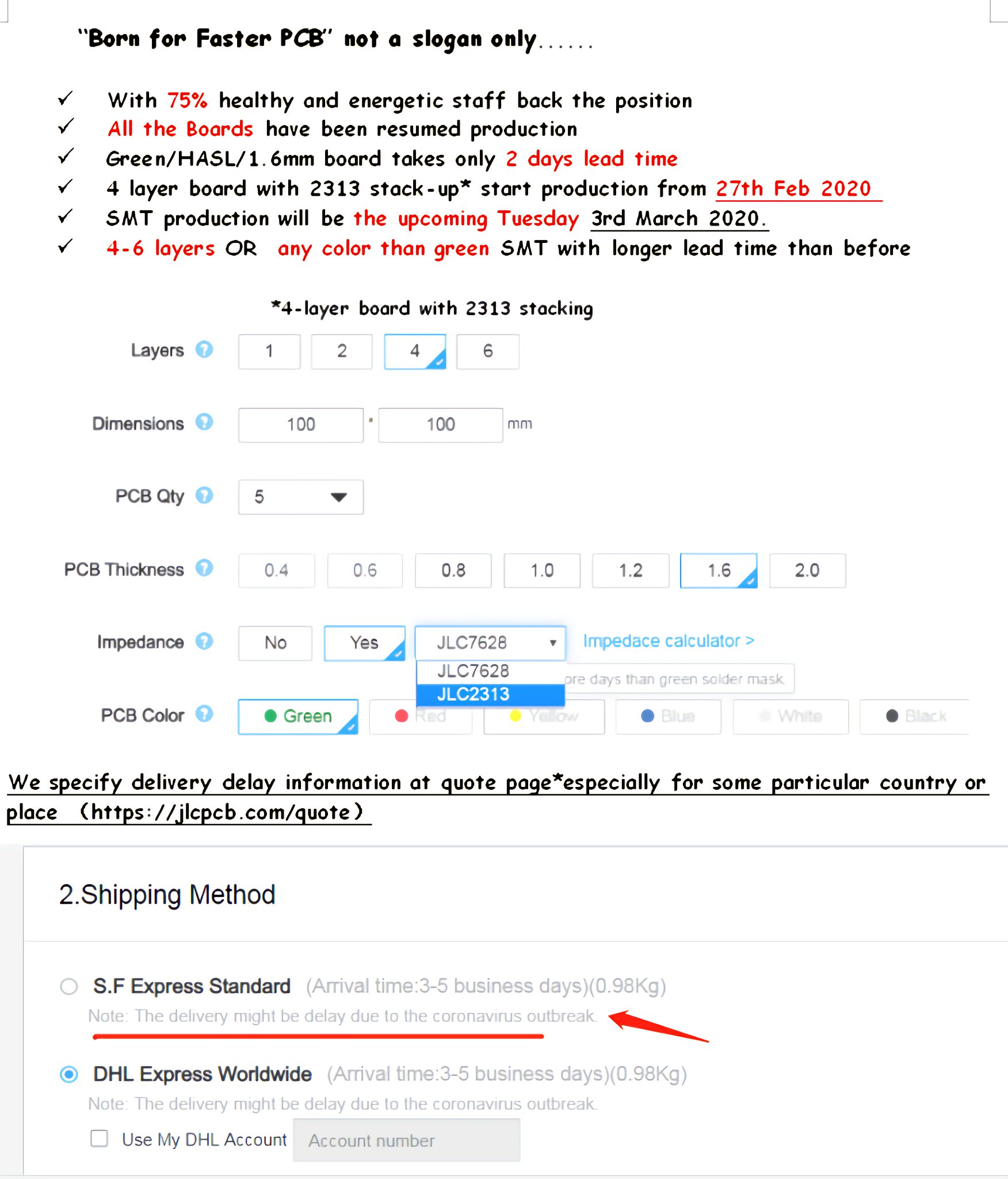 JLCPCB on Twitter: ““Born for Faster PCB” not a slogan only!!! Delivery delay information at quote page*especially for some particular country or place https://t.co/MgwNuBRuwd… https://t.co/4Byt6wEg0C”