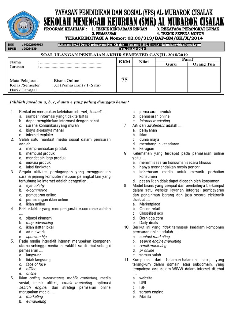 Soal Pemasaran Online Kelas 11 Semester 1 - Guru Ilmu Sosial
