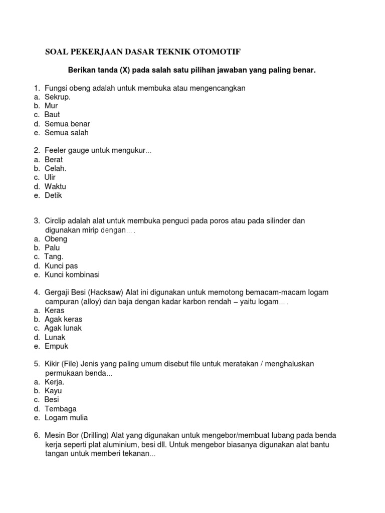 Soal Dan Jawaban Pekerjaan Dasar Teknik Otomotif – Kumpul Batik