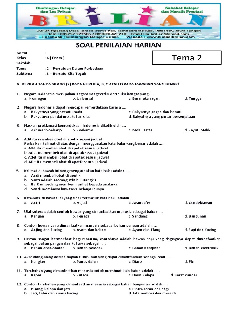Soal Tematik Kelas 6 SD Tema 2 Subtema 3 Bersatu Kita Teguh Dan …