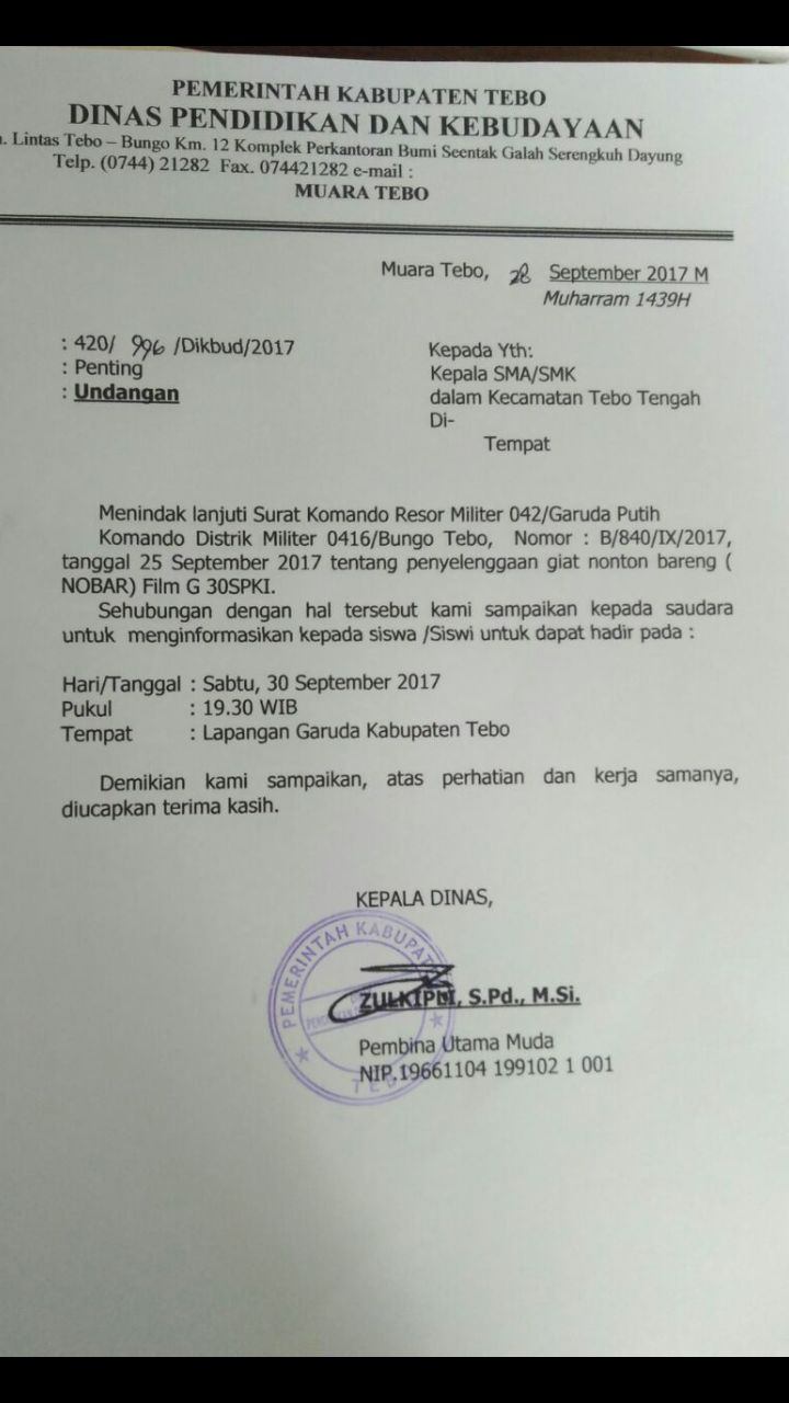Undangan NOBAR FIlm G 30 S PKI | Dinas Dikbud Kabupaten Tebo