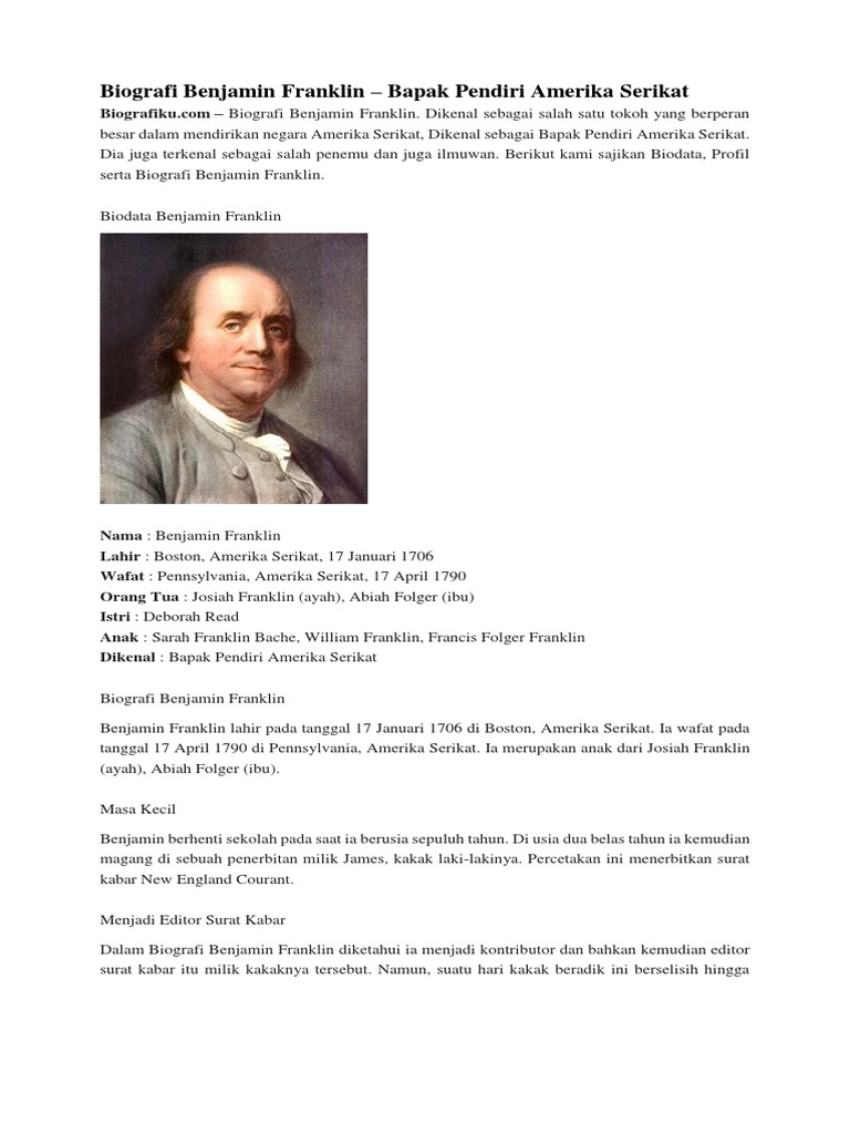 Biografi Singkat Tokoh: Biografi Singkat Benjamin Franklin (Pendiri Amerika dan Penemu Ternama)
