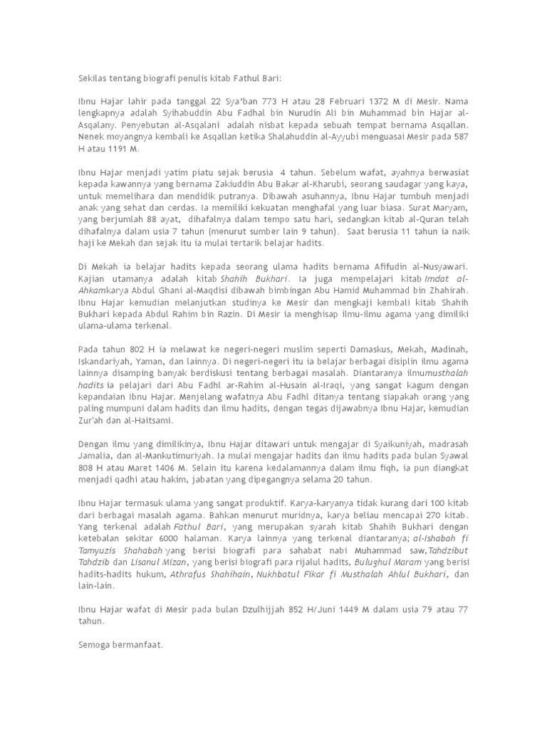 Sekilas Tentang Biografi Penulis Kitab Fathul Bari