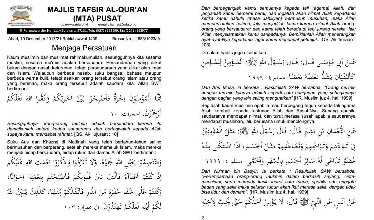 Kabar Berita MTA on Twitter: “Brosur Pengajian MTA 17-12-2017 : MENJAGA PERSATUAN Kaum muslimin dan muslimat rahimakumullah, sesungguhnya kita sesama muslim, sesama mu’min adalah bersaudara. Persaudaraan yang diikat oleh iman dan Islam #