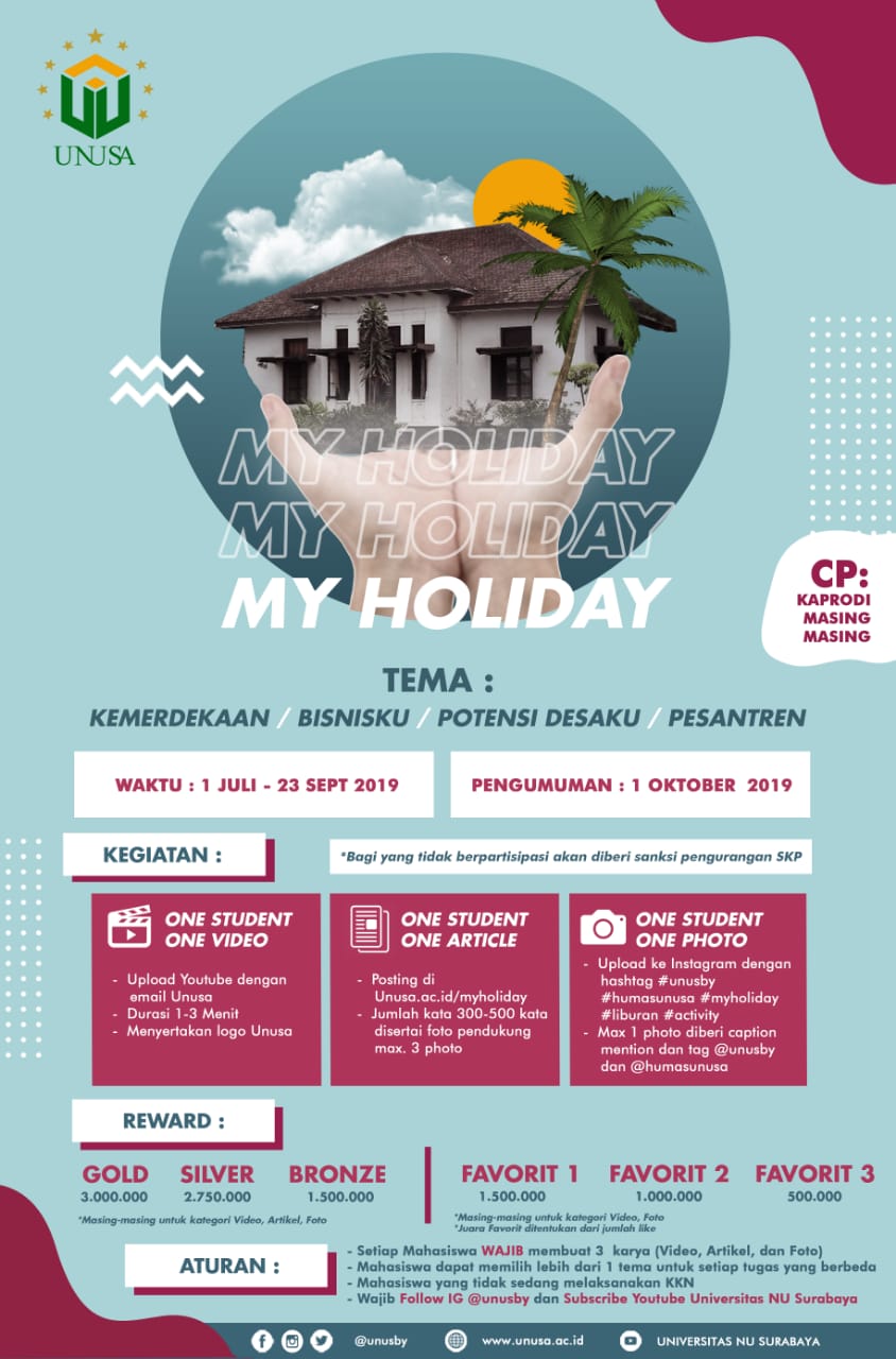 UNIVERSITAS NU SBY Twitter: “Assalamualaikum, Program baru dari unusa yaitu My Holiday . Dimana mahasiswa wajib membuat 3 karya (video, artikel, dan foto) di masa liburan semesternya . Jangan khawatir