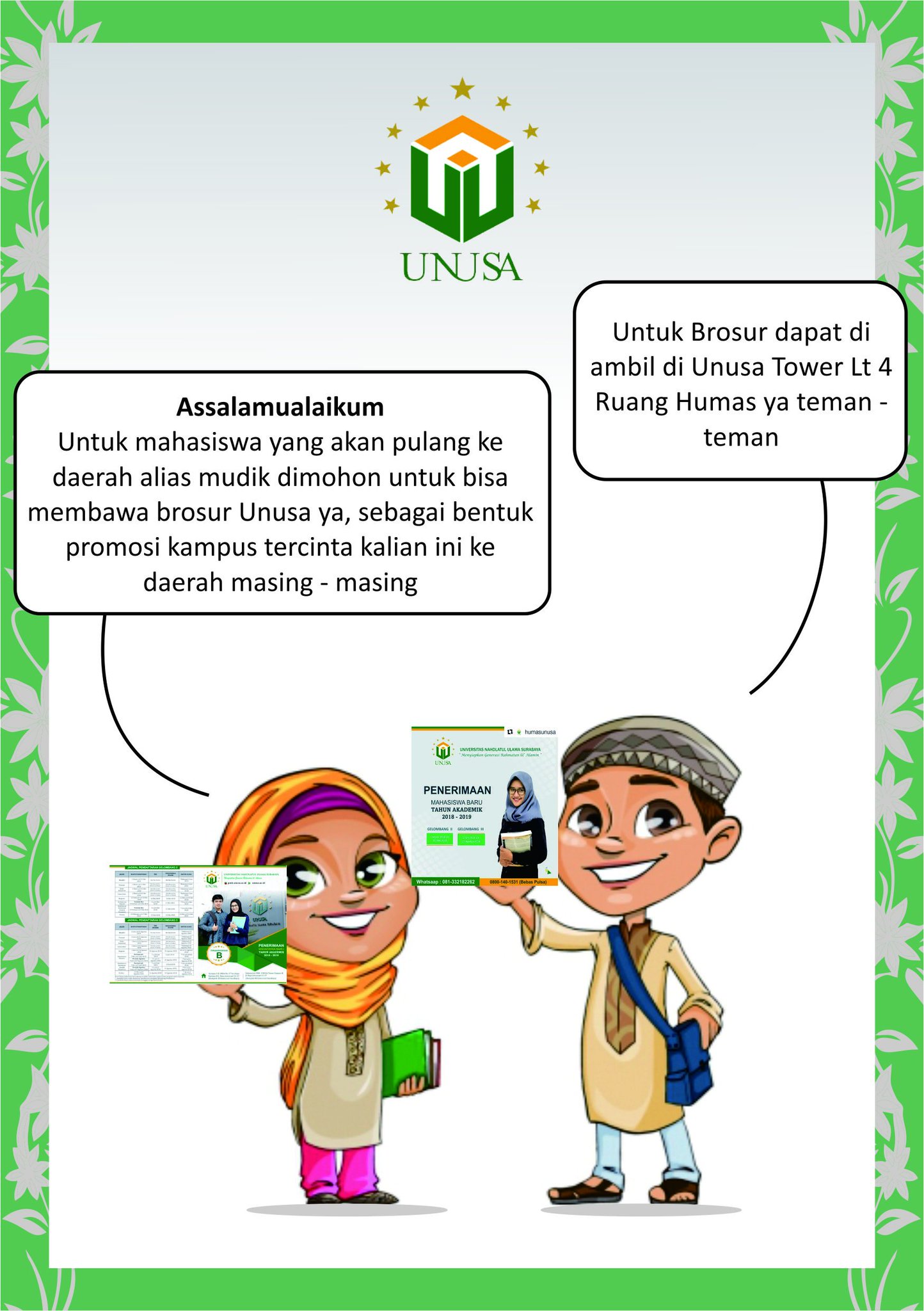 UNIVERSITAS NU SBY on Twitter: “Assalamualaikum. Untuk mahasiswa yang akan pulang kedaerah masing2 mohon di sertakan membawa brosur unusa sebagai bentuk promosi unusa ke daerah masing2. Brosur dapat di ambil di Unusa