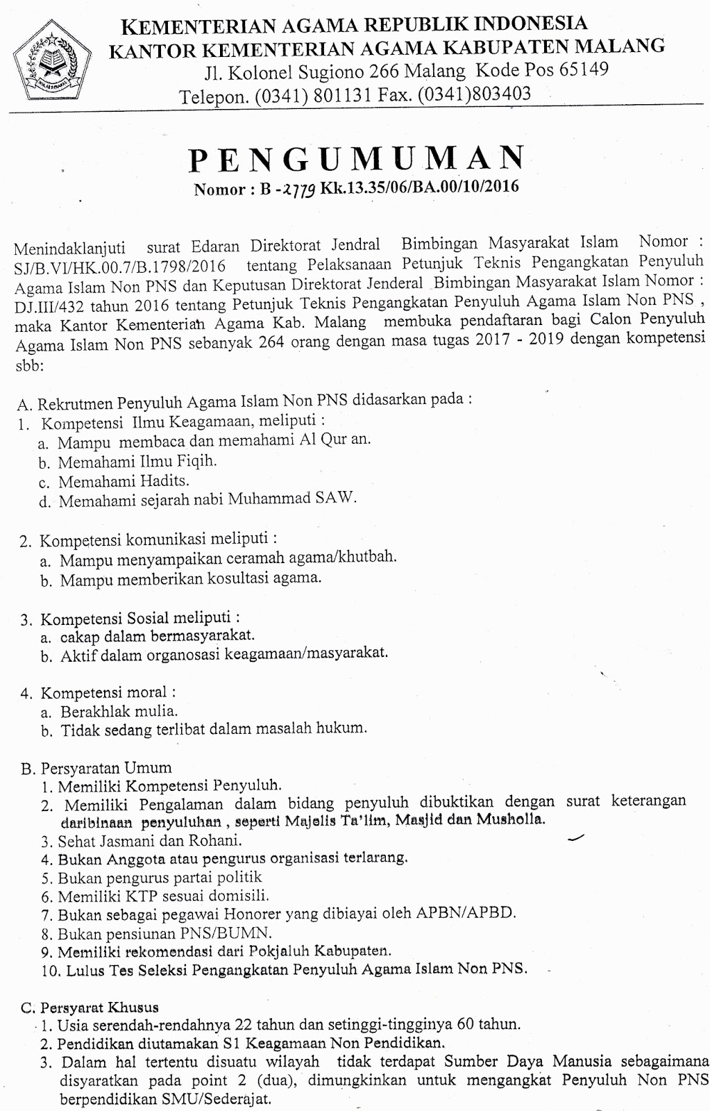 Kantor Urusan Agama Singosari: Penerimaan Penyuluh Agama Honorer Non PNS 2017-2019