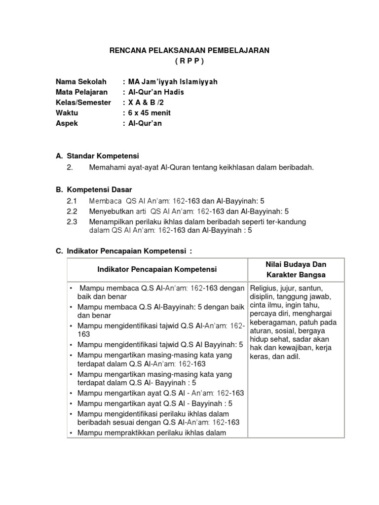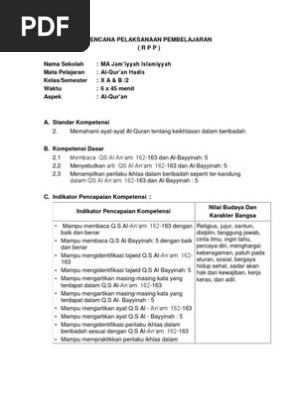 RPP Ayat Alquran Tntng Keikhlasan Dlm Beribadah