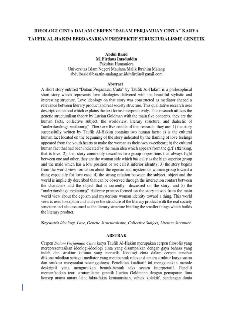 PDF) IDEOLOGI CINTA DALAM CERPEN “DALAM PERJAMUAN CINTA” KARYA TAUFIK AL-HAKIM BERDASARKAN PRESPEKTIF STRUKTURALISME GENETIK