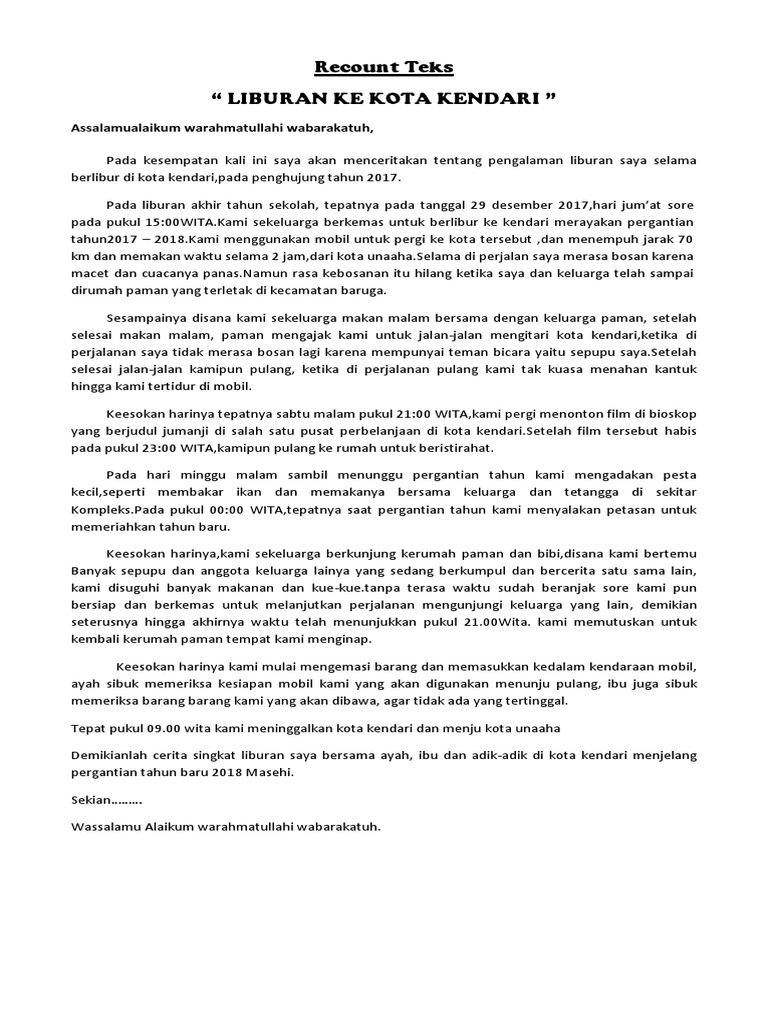 Recount Teks “ Liburan Ke Kota Kendari ”: Assalamualaikum warahmatullahi wabarakatuh,