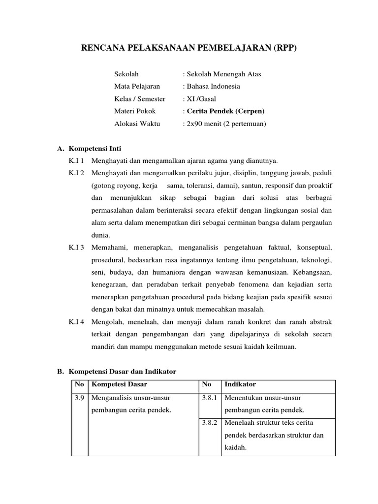 RPP B. Indo Kelas 11 rev 2018 3.9 dan 4.9 Teks Cerpen.docx - RENCANA PELAKSANAAN PEMBELAJARAN Sekolah Mata Pelajaran Kelas/Semester Materi Pokok Alokasi | Course Hero