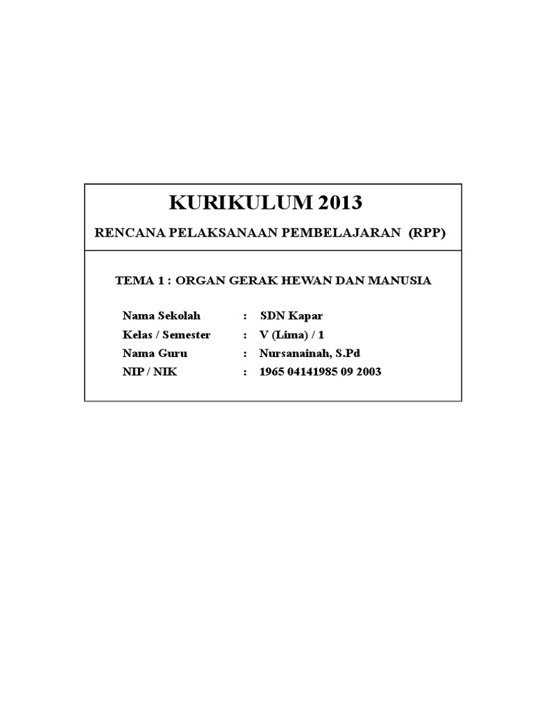1. RPP Tema 1 Organ Gerak Hewan Dan Manusia