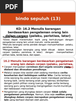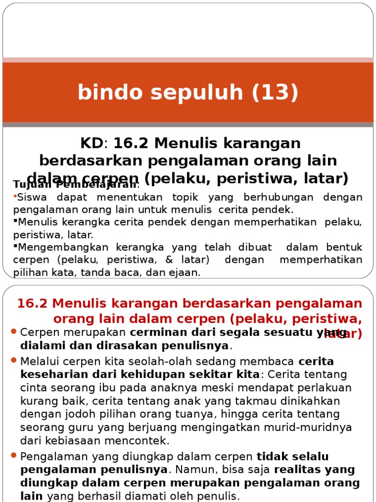 Bindo sepuluh (13) KD: 16.2 Menulis karangan berdasarkan pengalaman orang lain dalam cerpen (pelaku, peristiwa, latar) Tujuan Pembelajaran: Siswa dapat. - ppt download