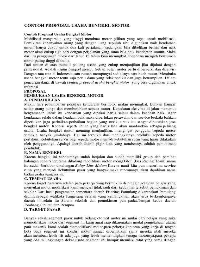DOC) PROPOSAL PENDIRIAN USAHA BENGKEL MOTOR | Guntar S Hadie - Academia.edu