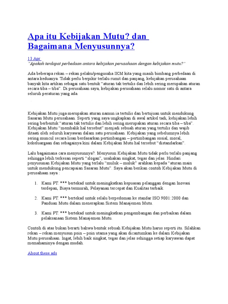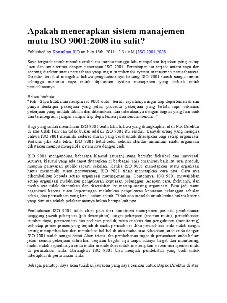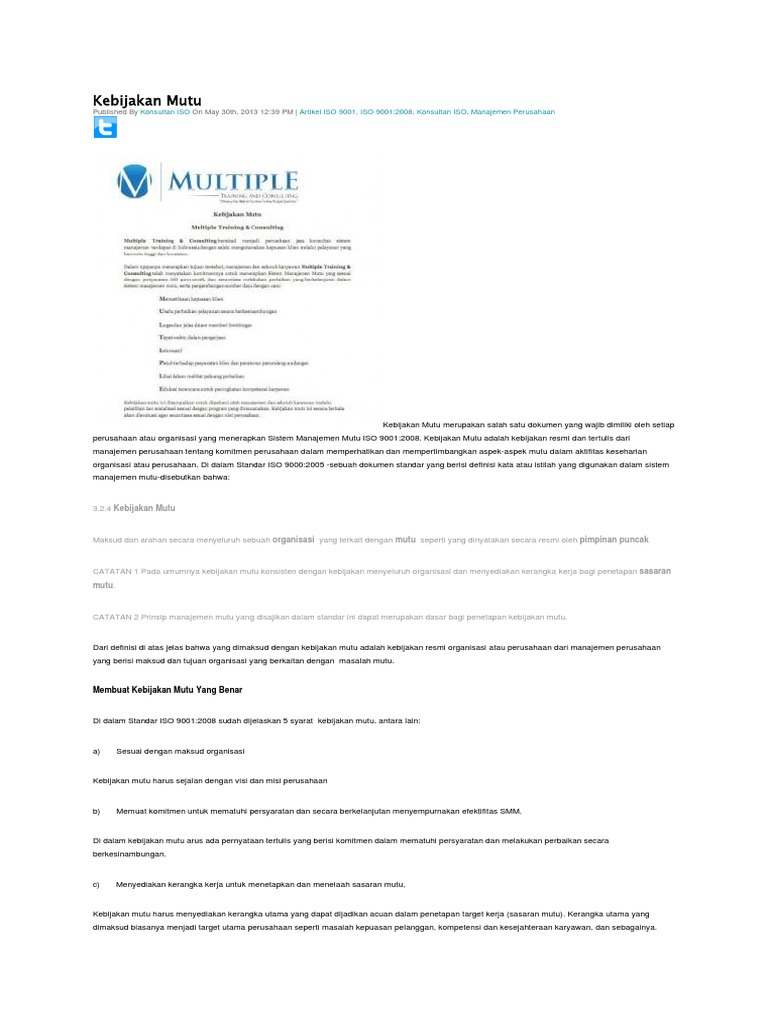 Kebijakan Mutu: Konsultan ISO Artikel ISO 9001 ISO 9001:2008 Konsultan ISO Manajemen Perusahaan