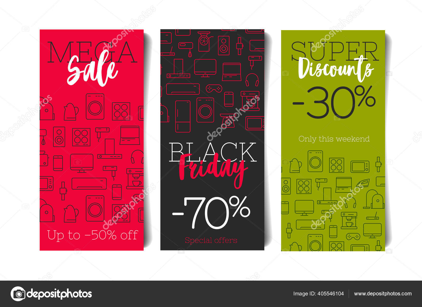 Set brosur untuk promo iklan Jumat hitam penjualan dengan diskon di rumah, dapur dan elektronik cerdas dan gadget dengan diskon — Stok Vektor © marinaionova #405546104