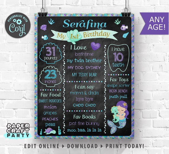 Mermaid Printable Chalkboard Sign, Milestone Poster, 1st 2nd 3rd Birthday, Under the Sea, Edit Online + Download Today With Free Corjl.com by Paper Craft Party | Catch My Party