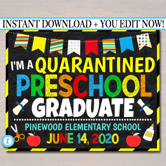 Preschool Graduation Quarantine 2020, Photo End of School Chalkboard Poster, Virtual Online Last Day School Printable, EDITABLE TEMPLATE by TidyLady Printables | Catch My Party