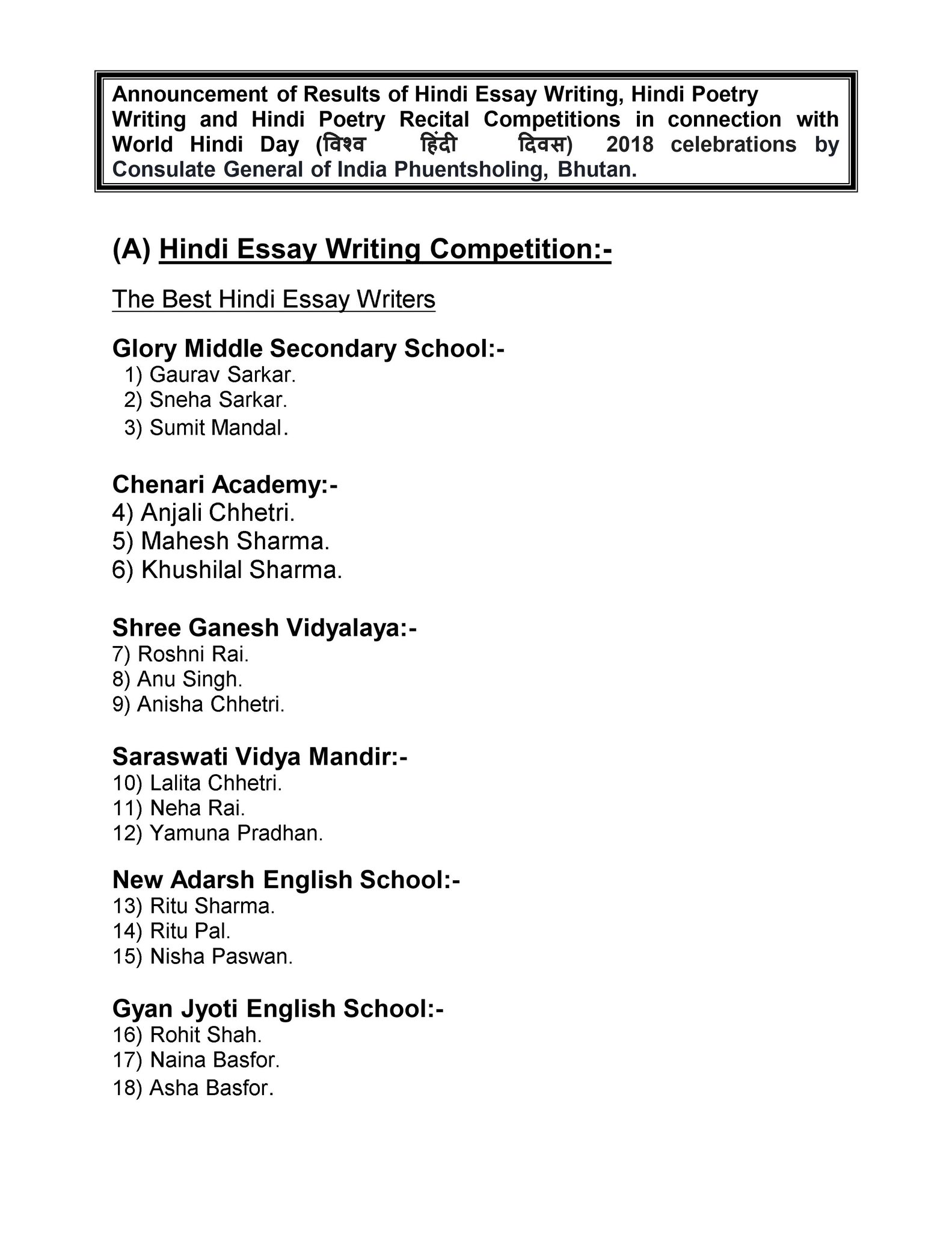 India in Phuentsholing on Twitter: “Announcement of Results of Hindi Essay Writing, Hindi Poetry Writing and Hindi Poetry Recital Competitions in connection with World Hindi Day ( ) 2018 celebrations by