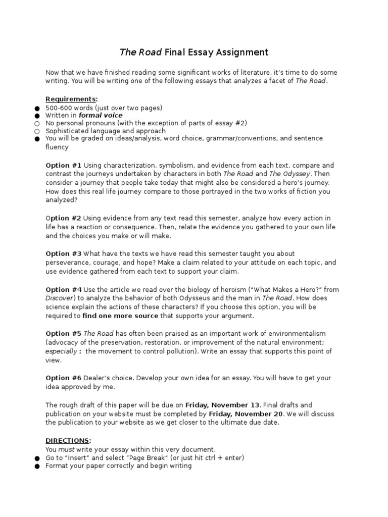 the road final essay assignment | Odyssey | Essays