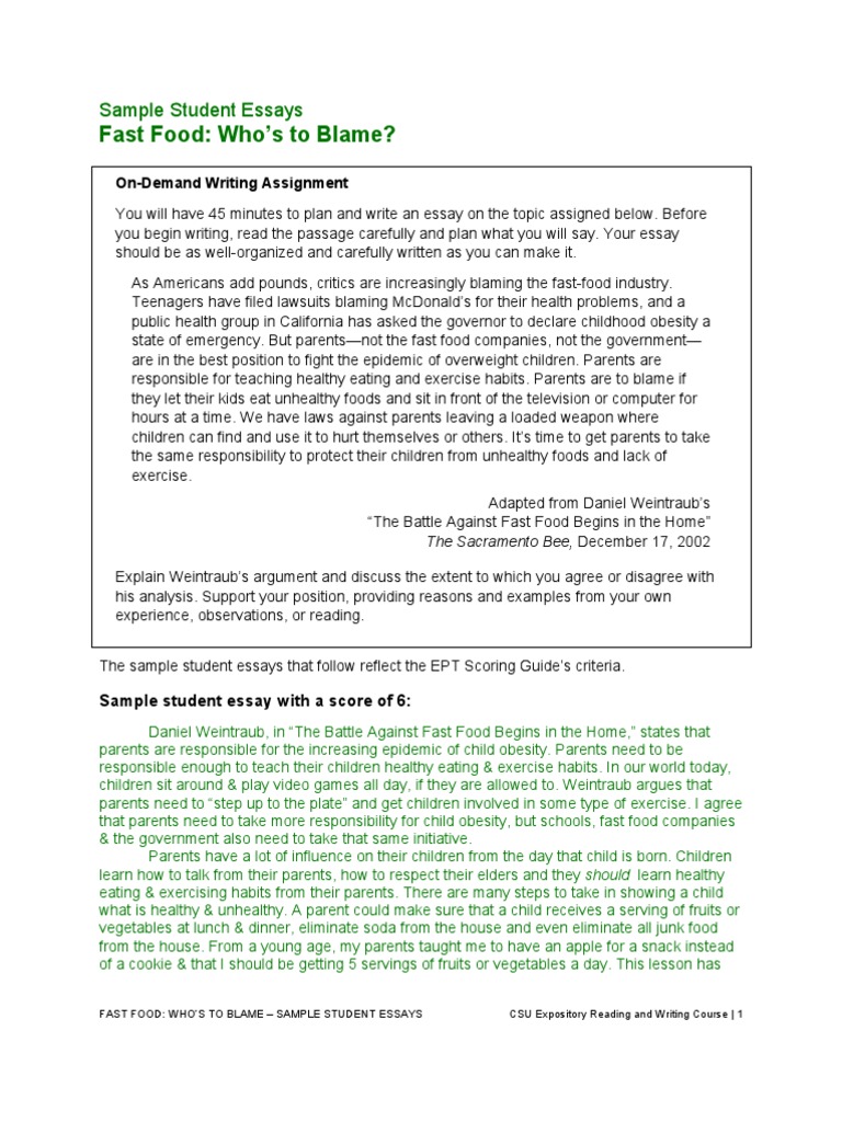 Fast Food Sample Student Essays | Childhood Obesity | Essays