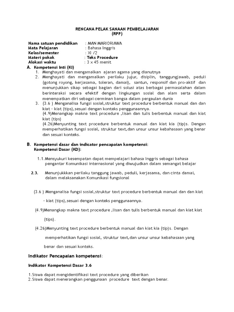 4. RPP Bahasa Inggris Kelas 9 SMP-MTs Semester 1 Materi PROCEDURE TEXT