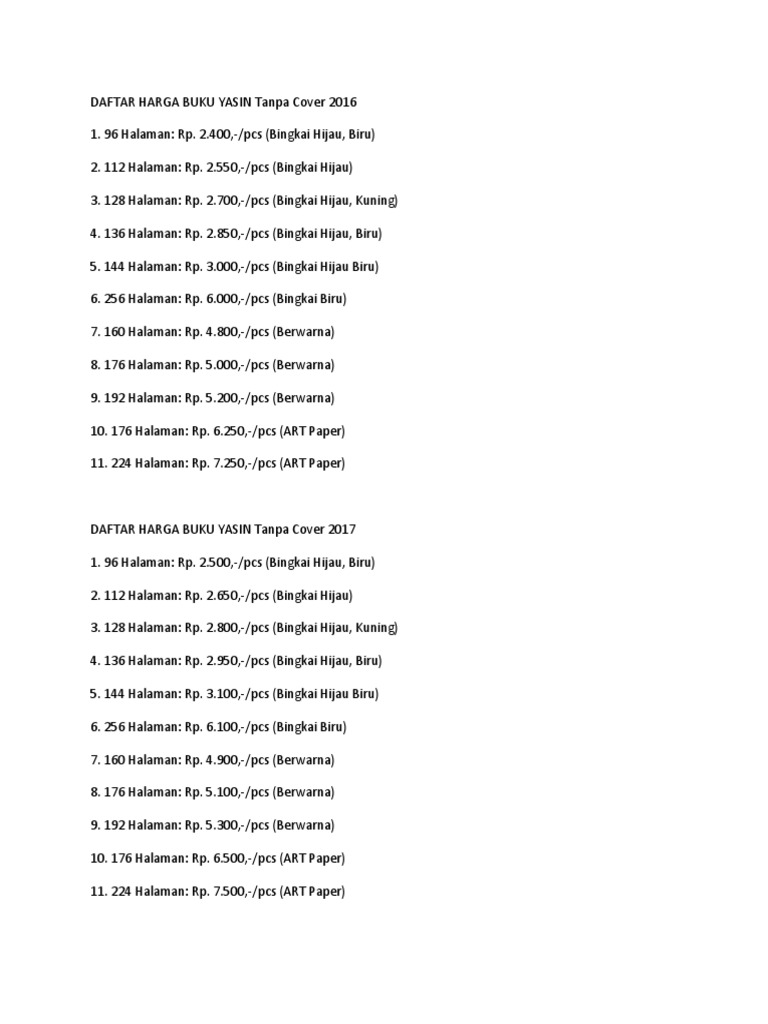 Daftar Harga Buku Yasin Tanpa Cover 2016
