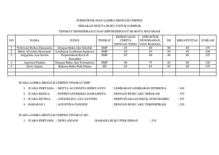 Form Penilaian Lomba Menulis Cerpen
