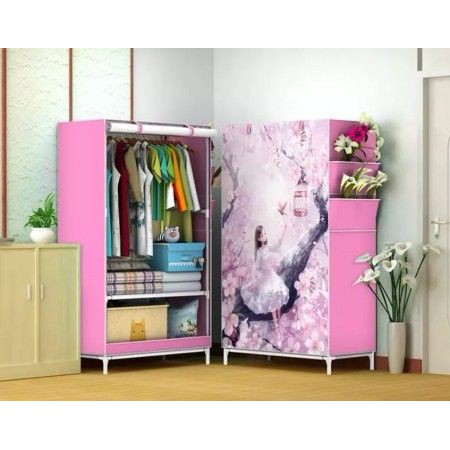 Lemari rak pakaian baju kain anak portable minimalis bongkar pasang rakit lipat ada gantungan kabinet wardrobe hijab dengan resleting serbaguna rangka besi stainless unik jual harga murah grosir ukuran sedang Motif karakter (