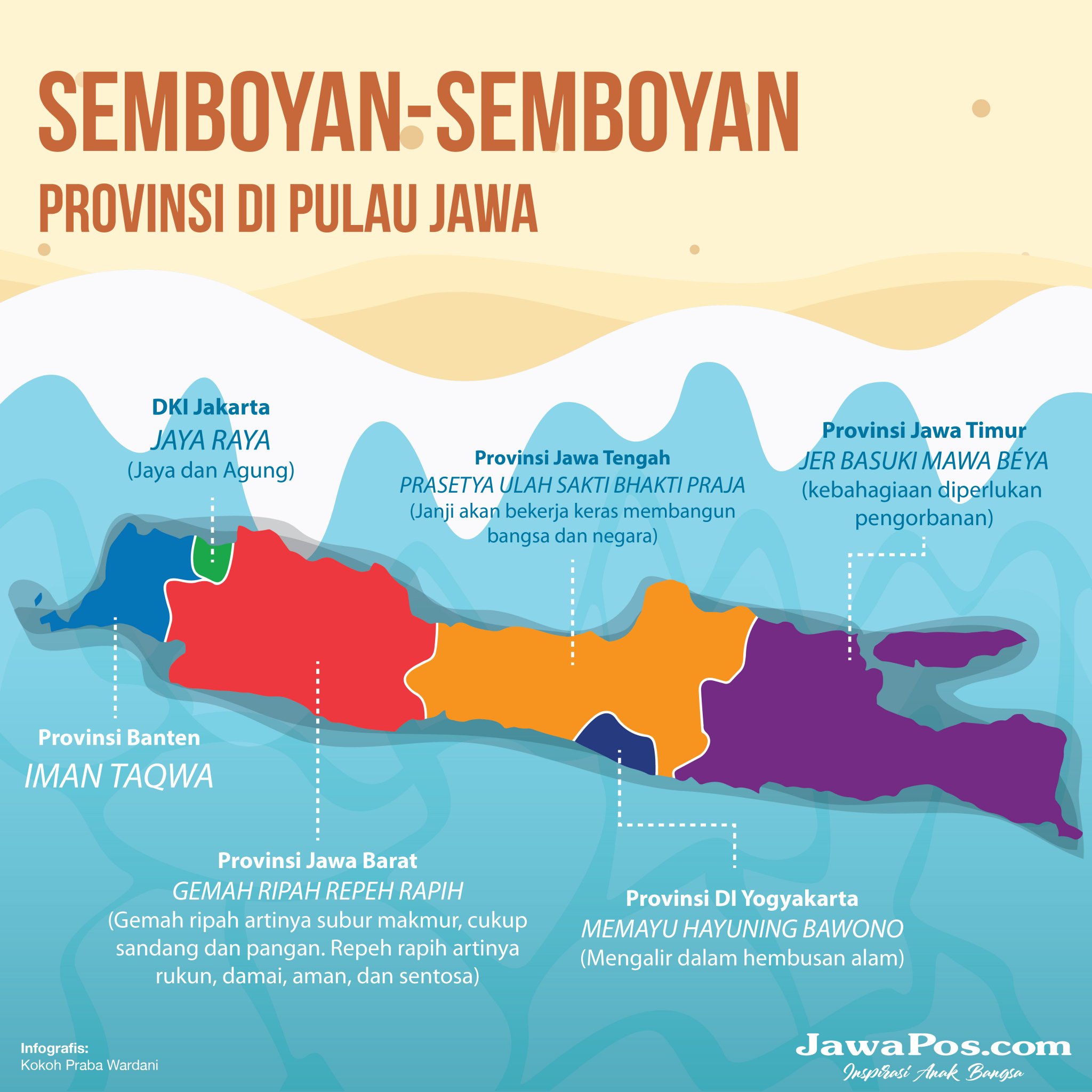 Jawa Pos “Setiap Provinsi di Pulau Jawa memiliki semboyan yang berbeda-beda loh. Semboyan tersebut merupakan identitas sendiri dari sebuah provinsi yang menggambarkan nilai sejarah daerah tersebut. Apa semboyan di kota