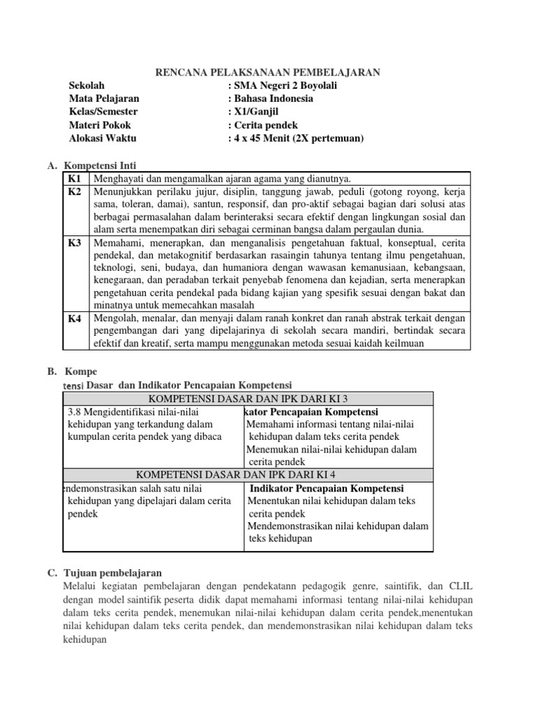 DOC) RENCANA PELAKSANAAN PEMBELAJARAN Sekolah : SMK Sehati Karawang Mata Pelajaran : Bahasa Indonesia Kelas/Semester : X1/Ganjil Materi Pokok : Cerita pendek Alokasi Waktu : 4 x 45 Menit (2X pertemuan | Siti Masturoh - Academia.edu