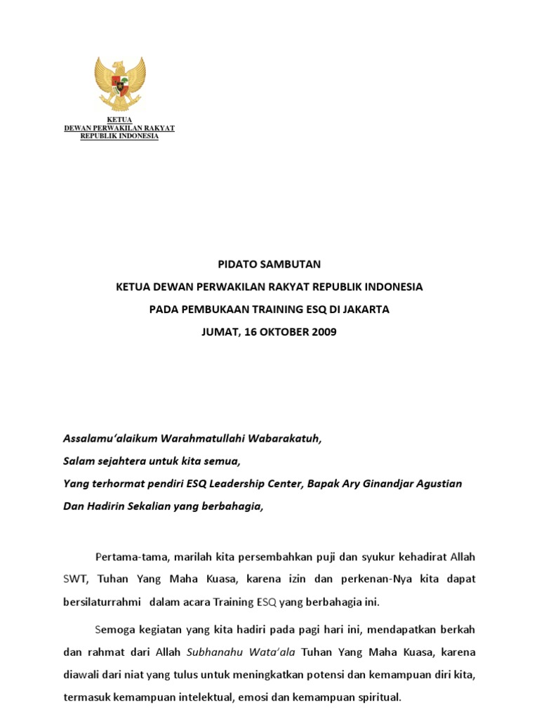 Pidato Sambutan Ketua DPR Ri Pada Pembukaan Training ESQ di Jakarta, 16 Oktober 2009