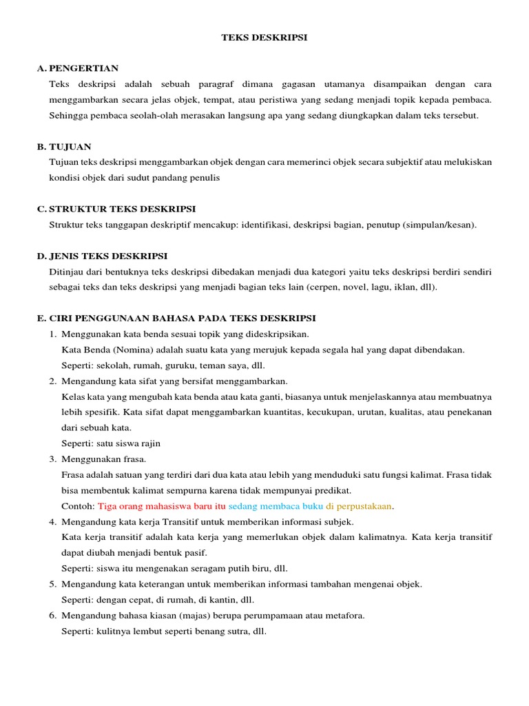 TEKS DESKRIPSI.docx - TEKS DESKRIPSI Ciri teks deskripsi= Ciri tujuan Menggambarkan objek dengan cara memerinci objek secara subjektif(melukiskan objek | Course Hero