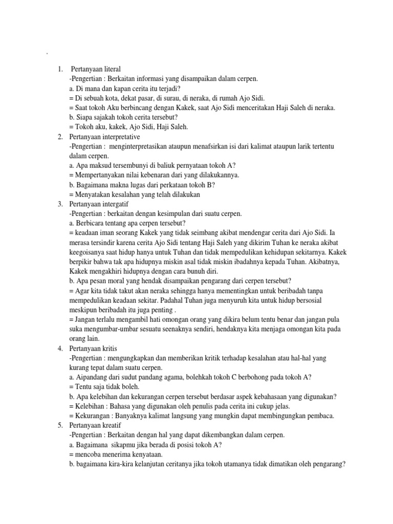 Jawaban dari pertanyaan literal,interpretatif,integratif,kritis,kreatif tentang cerpen robohnya - Brainly.co.id