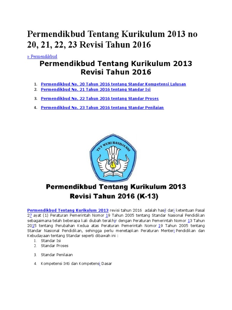 Payung Hukum yang Baru Tahun 2016 untuk Pelaksanaan Kurikulum 2013 …