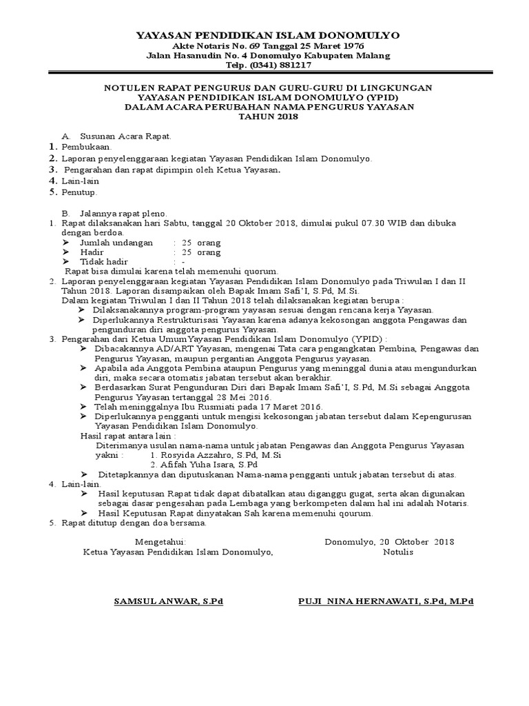 Contoh Notulen Rapat Perubahan Pengurus Yayasan - Barisan Contoh